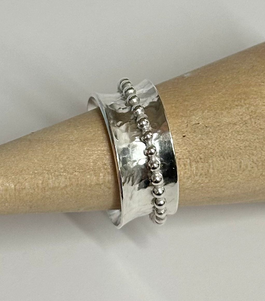 Grounded yet effortlessly stylish, this handcrafted sterling silver spinner ring combines form and function in perfect balance. The wide, textured band is detailed with a hammered texture finish, while a single ball spinning ring glides freely around the centre – a subtle reminder to stay calm and centred through life’s chaos.