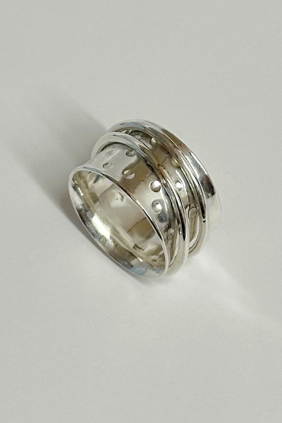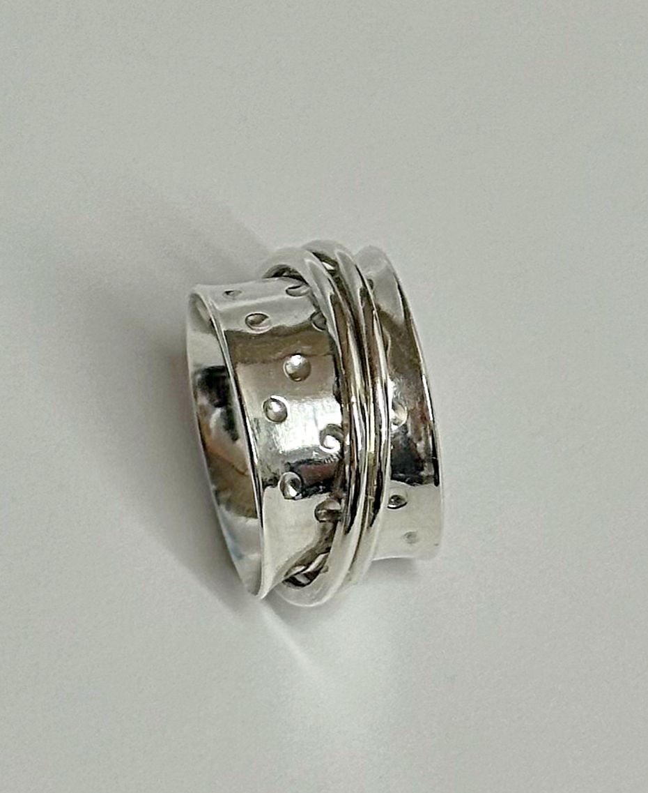 Grounded yet effortlessly stylish, this handcrafted sterling silver spinner ring combines form and function in perfect balance. The wide, textured band is detailed with a spotted tactile finish, while two smooth spinning rings glide freely around the centre – a subtle reminder to stay calm and centred through life’s chaos. Designed for modern women who value both strength and serenity, it’s a statement piece that feels as empowering as it looks. A beautifully balanced piece – bold enough to stand alone, yet effortlessly wearable for everyday mindfulness. Metal: Sterling Silver Design: Wide textured band with two high polished inner rings. Finish: Spotted texture Style: Contemporary, Relaxed, Grounding. Size: Available in sizes K – T You will be emailed the dispatch date for you order and consequently, you will be emailed delivery details. If your item is in stock, we will wend send it out by the second business day from receipt of your order. If your item is not in stock or you want to make changes to the metal or stone used, we will be hand making it from scratch, which can take from 11 to 27 working days. Some rare products can take up to 6 weeks. Bespoke jewellery orders, where we are custom making you, a one-off piece can take longer to make, depending upon what you have requested, We say to allow 3-6 weeks and you will be provided with a production timescale when you receive your quote. To find out if an item is in stock or for urgent orders, please use the contact us page to get in touch