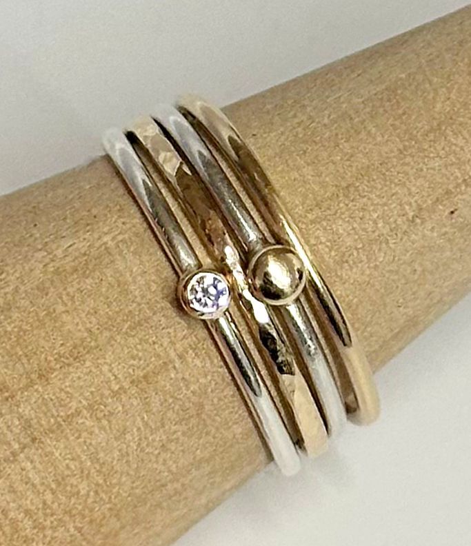 Delicate, versatile and designed for effortless layering – this set of four mixed metal stacker rings brings understated luxury to everyday wear. Each ring is handcrafted in sterling silver and 9ct gold, featuring a subtle mix of smooth, hammered and polished textures. The highlight: a sparkling lab grown diamond, ethically created for brilliance without compromise. Whether worn solo for a refined touch or stacked for a modern, curated look, these rings are made for women who value elegance with intention. • Metals: Sterling silver and 9ct Gold. • Gemstone: Lab-Grown Diamond. • Design: 4 rings of Mixed textures. • Finish: High Polish. • Style: Minimalist, ethical, everyday luxury. • Sizes: K-T UK You will be emailed the dispatch date for you order and consequently, you will be emailed delivery details. If your item is in stock, we will wend send it out by the second business day from receipt of your order. If your item is not in stock or you want to make changes to the metal or stone used, we will be hand making it from scratch, which can take from 11 to 27 working days. Some rare products can take up to 6 weeks. Bespoke jewellery orders, where we are custom making you, a one-off piece can take longer to make, depending upon what you have requested, We say to allow 3-6 weeks and you will be provided with a production timescale when you receive your quote. To find out if an item is in stock or for urgent orders, please use the contact us page to get in touch.